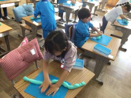 今日は、粘土をたくさんこねました。「ねんどたいそう」をやってみました。みんな、立ち上がって頑張りました。