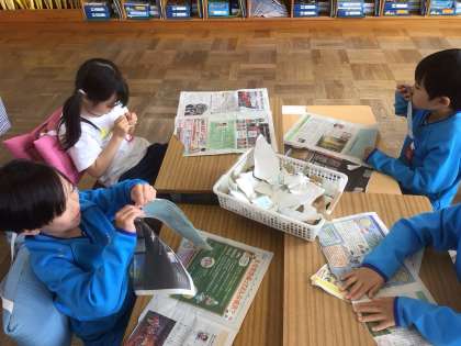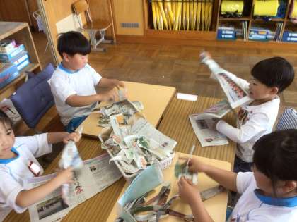 「やぶいやかたちからうまれたよ」の学習です。今日の時間は、紙の感触を味わったり、においをかいでみたり、また、破った時の音を聞いたりしました。みんなとても楽しそうでした。