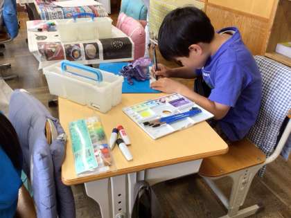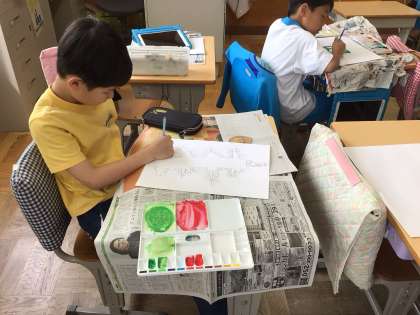 種を紙粘土で作り、種から咲いた花を画用紙に描いています。