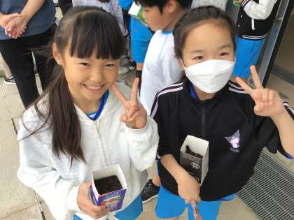 今日は、持ってきた牛乳パックに土を入れてツルレイシの種子を植えました。