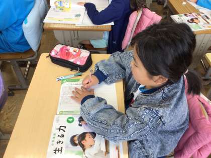 今日は、小さな草たちにはく手をの教材を使って自然と共に生活していることについて考えました。考えたことをノートに書いてまとめました。書いた内容をみんなの前で発表していました。