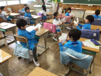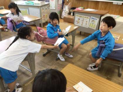 今日は、名刺交換をしました。自分で作った名刺をもって「よろしくね」と伝えました。