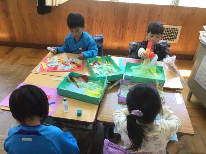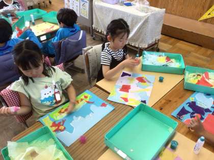 「やぶいたかたちからうまれたよ」の学習です。紙を破ったり、ちぎったりして台紙の上に置いて、想像をふくらませました。