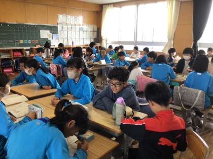 国語の学習で、5年生が6年生に委員会活動についてインタビューをしました。真剣に質問する5年生と優しく教える6年生。有意義な時間になりました。