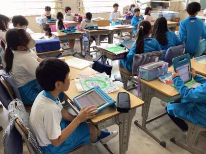 学校のお花を描き、タブレットで「絵を描くときに大変だったこと」等をかいて、学習を振り返りました。