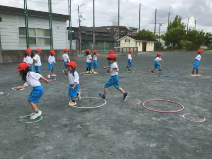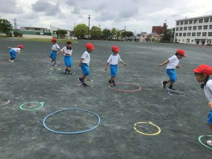 フラフープを使って、飛ぶ練習をしました。片足でけんけんしたり、両足で力強く飛んだりしました。