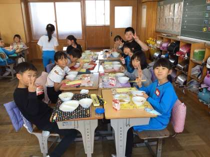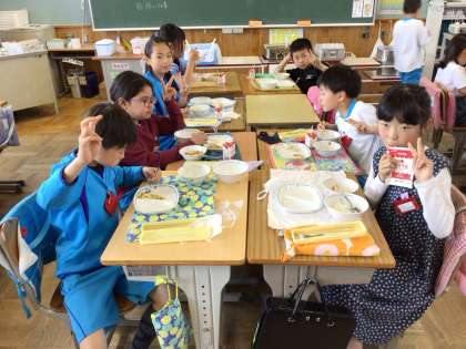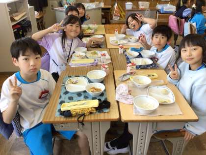 昨日の1組の様子です。メニューは、ごはん、とうふのちゅうかに、ショウロンポウ、バンサンスー、牛乳でした。どのメニューも美味しくいただきました。