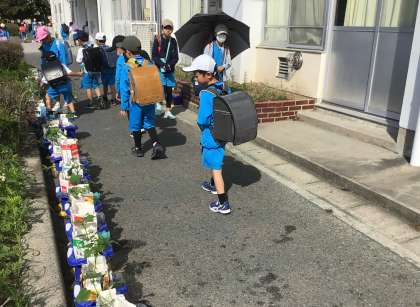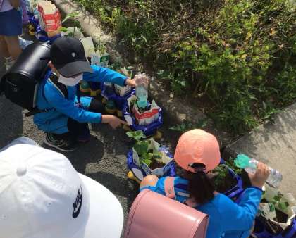 また、別の子が、先生、見て!と言うのでのぞいたら、ミニトマトの青い実がついていました。