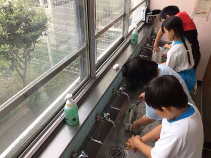 手についた絵の具を丁寧に洗って落としたり、水入れの水を周りに飛び散らないように流したりと、しっかりと片付けることができました。