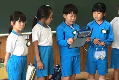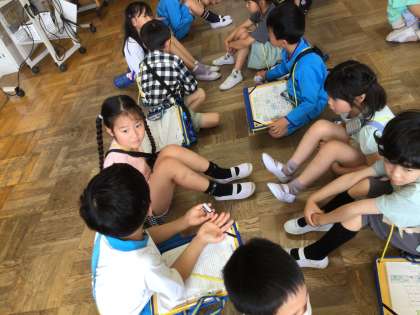2年生が1年生に学校を案内しました。自分たちで文章を考えたり、話す練習をしたりして、本番を迎えました。おわった後は、「1年生が喜んでくれて嬉しかった」「またやりたい」とみんなが良い顔をしていました。