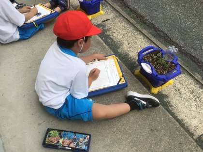 あさがおの観察では、葉の形が「ハートみたい」「うさぎの耳みたい」という声が聞こえてきました。「なんだかかわいいね」と、うれしそうに話す子もいてとっても愛着をもって育てていることが伝わってきました。