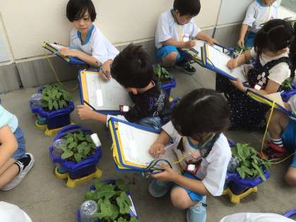 あさがおが、大きくなりました。「ハートの形の葉っぱじゃないのが出てきた〜!」と。みんなで見に行きました。