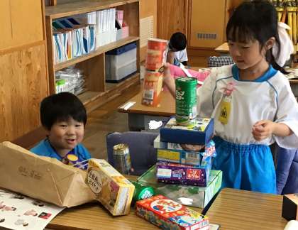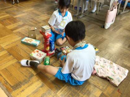 家庭から持ち寄った箱を使って、何ができるかな?2人で話し合いながら形づくりを楽しみました。