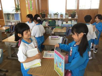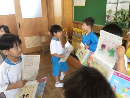 学校で見つけたことをクイズにして、友だちと会話を楽しみました。「◯ではじまります」という言い方を覚え、たくさんの友だちに問題を出していました。