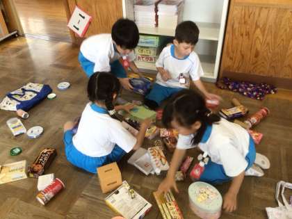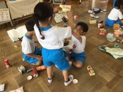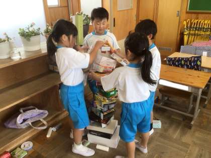 「いろいろなかたち」の学習です。箱や缶の特徴を考えて、グループで『つみつみ競争』をして楽しみました。