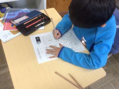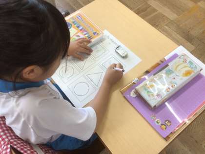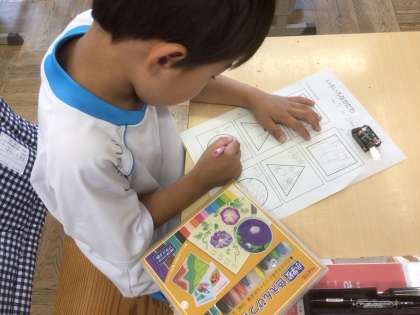 三角や四角、丸で表されるものの絵、とっても素敵でした。アイデアいっぱいな友達を見て「すご〜い」と見入っている姿もありました。