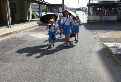 暑さをしのぐため、日傘をさす子が増えてきました。