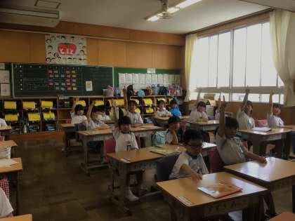 学校探検で見つけたもののクイズを出しています。 質問をして答えを導き出します。