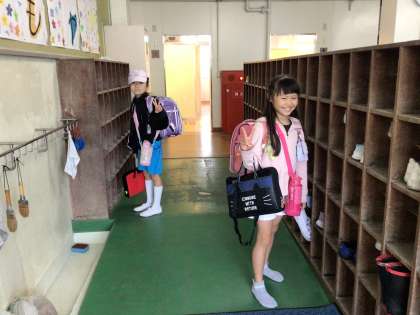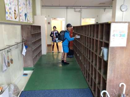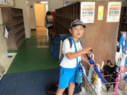 雨が降る中の登校となりました。傘を縛って傘立てに置いています。