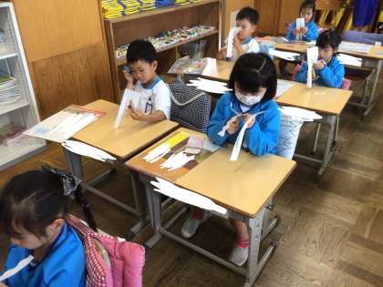 ハサミで真っ直ぐの線やジグザグの線を切る練習をしています。