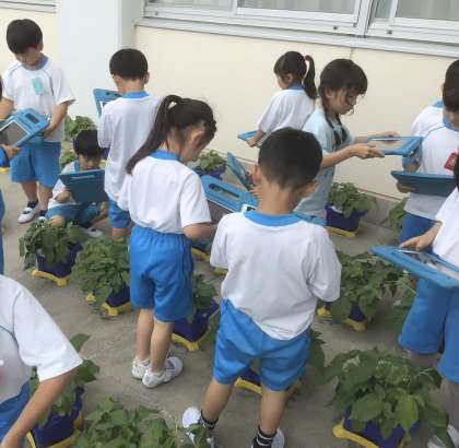あさがおの写真をとりました。どこからどうやって撮ろうかな?みんな真剣です。
