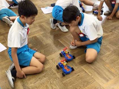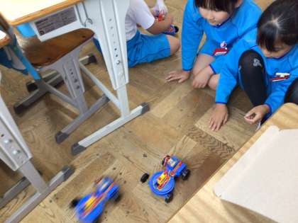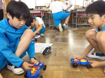 1組の様子です。電気のはたらきの学習です。乾電池を直列でつないだときのモーターの回る速さを調べていました。