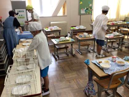 給食を準備している様子です。 自分の役割をきちんと果たしています。
