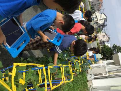 夏野菜の観察をしました。前に観察したときと比べて大きくなっていたり、葉や花の数が増えていたりすることに気づき、みんなうれしそうです。夏野菜の種類によってはまだ収穫できないものもありますが、少しの変化にも気づき、成長の喜びを感じています。