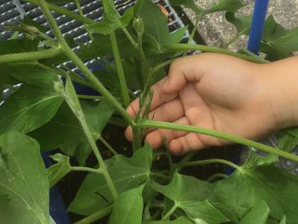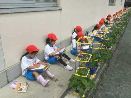 あさがおの観察では、触ってみると「ちくちくする」「けがいっぱい生えてる」という声が聞こえてきました。じっくり観察して見つけました。