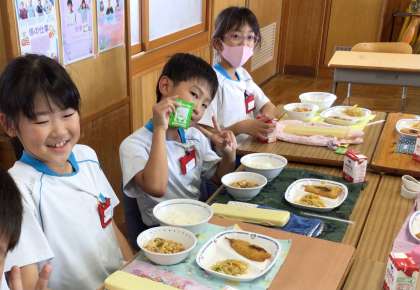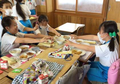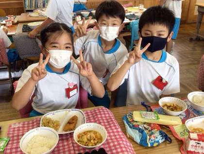 1組の様子です。メニューに抹茶ふりかけがありました。ふりかけとコーヒー牛乳の素は大好評です。