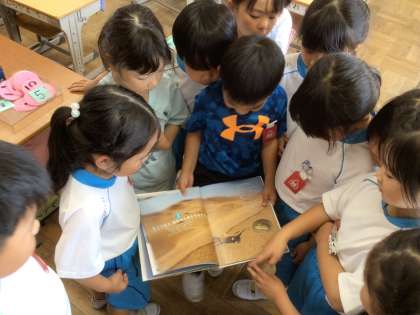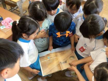友だちが、図書館で本を見つけてきました。なんと、国語の学習で学んだ「どうやってみをまもるのかな」に出てくる動物の詳しい身の守り方が載っていた本です。みんな、のぞきこんで見ていました。