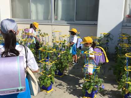 1年生の子たちが、アサガオに水をあげていました。