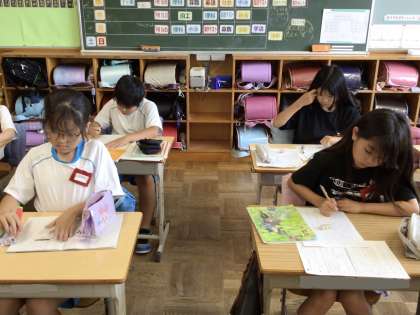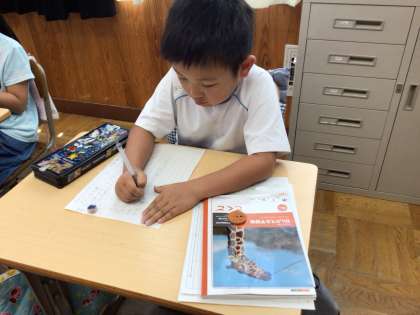 山場のある物語を書いています。明日の発表会に向けて丁寧な字で清書しています。