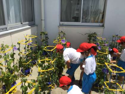 あさがおのお世話、続けています。もう、お花が咲き始めました。