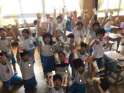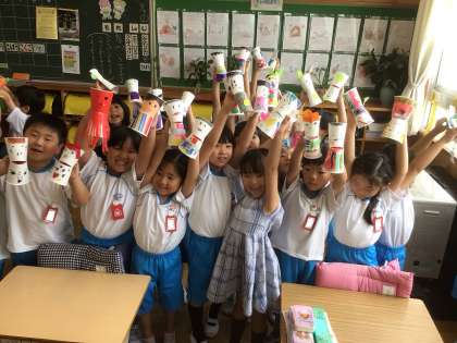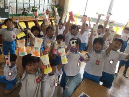 「みんなだいすき ぱくぱっくん」の学習です。紙コップを使って、作りました。紙コップに切り込みを入れ、パクパク動かせるようにしました。さあ、何ができたかな?みんなで、「ハイポーズ!」
