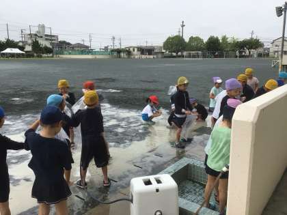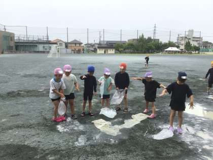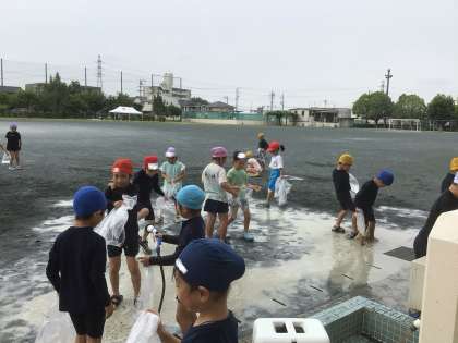 「なつとなかよし」の学習です。みんな、ビニール袋をもってとびっきりの笑顔です。お水をいっぱい入れて、バシャーン!