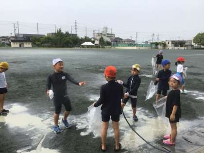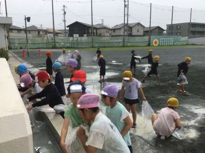 水遊びは楽しいね。できた水たまりに入って、楽しんでいる子もいましたよ。