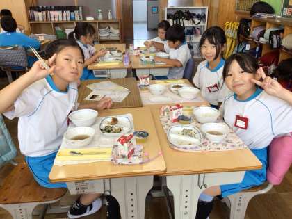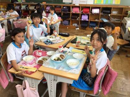 この日のメニューは、ごはん、ハンバーグのおろしソースかけ、七夕サラダ、天の川汁、星がたパインゼリーー牛乳でした。七夕サラダには、星がたの具材も入っていてとても好評でした。