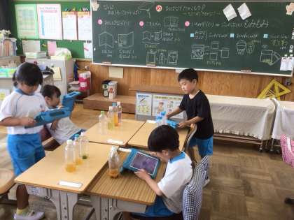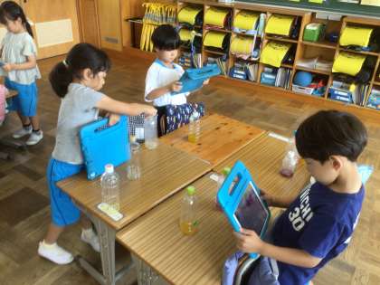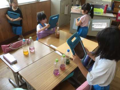 色水作りの最後には、ペットボトルに色水を作りました。まるでほんものの美味しそうなジュースが出来上がりました。記念に、タブレットで写真を撮りました。
