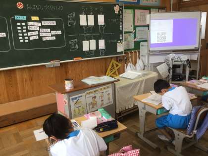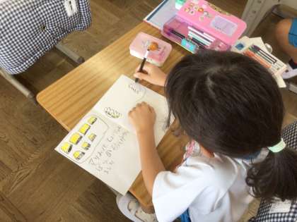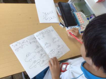 自分で作るたし算やひき算のお話を、一生懸命作っています。絵や文で分かりやすく作っていますよ。