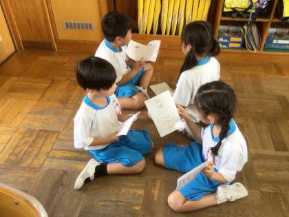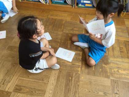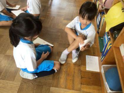「おはなしづくり」の学習です。出来上がったたし算とひき算のお話を、友だちに聞いてもらっています。自分で作ったお話は「はずかしい」と言っていましたが、とってもうれしそうです。
