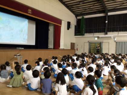 写真は、交通安全の話の中で、映像を見て危険箇所を考えている様子です。