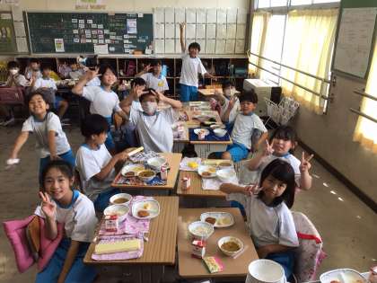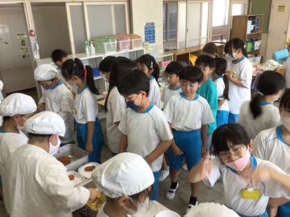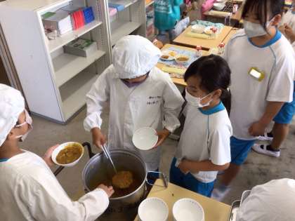 今日はカレー! 久しぶりの給食当番も頑張っています!