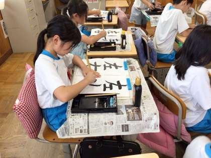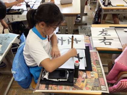 毛筆で「左右」を練習しています。