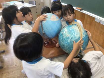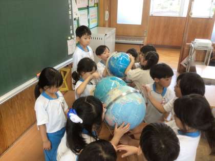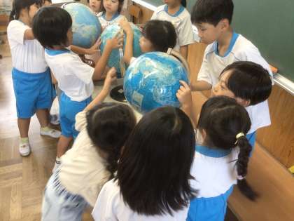 「あるけあるけ」という詩に、「ちきゅうのたいこ」という言葉が出てきました。そこで、地球儀を使って反対側にある国や、すぐ近くの外国を探したり見たりして学び合いました。休み時間にもかかわらず、地球儀は大人気でした。