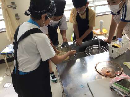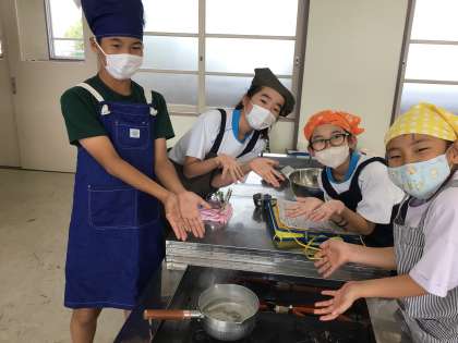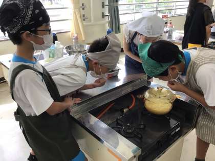 5年生が家庭科の調理実習で、鍋でご飯を炊き、出汁をとって味噌汁を作りました。ご飯の炊ける匂いと、出汁の香りに、「いい匂いがするよ!」と嬉しそうでした。