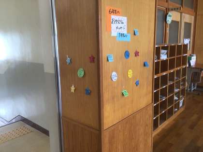 1年生の子が、修学旅行に出かける6年生のお兄さんお姉さんに向けて、メッセージを書きました。「いってらっしゃい」「おかえりなさい」の思いが、届くといいな。