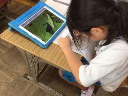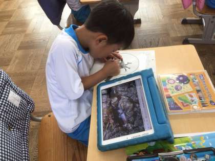 教科書のQRコード「むしむしむし」を読み取り、気になった虫さんを、観察しました。顔や体の特徴をよ〜く見ました。
