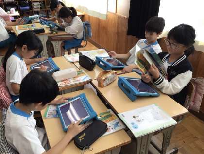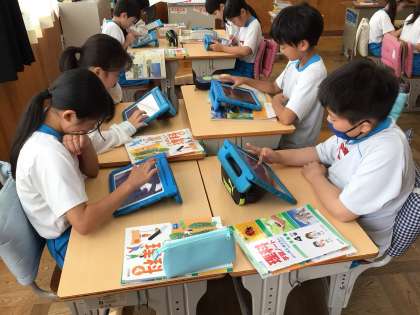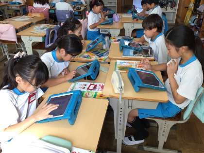 星や月の学習をしています。時間がたつと、半月の位置はどのように変わるのだろうという問いにふきだしくんというアプリを使って話し合いをしました。