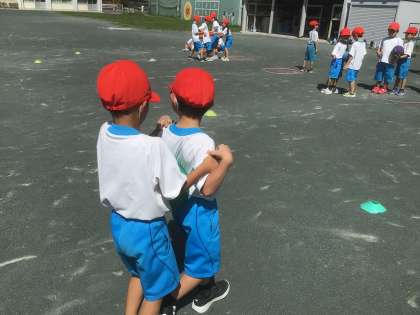 ボールを体にはさみ、作ったコースを工夫しながら走りました。腕を組んだり、肩をもったり、協力して走りました。